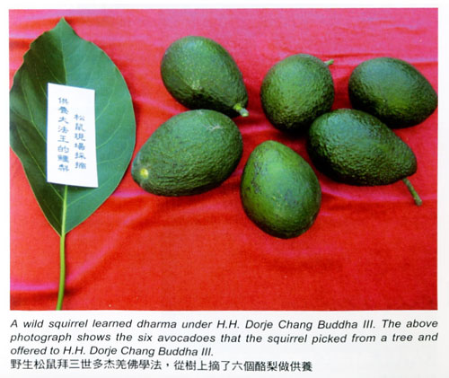 公元二零零零年四月二十六日下午,隆智(即丹玛·翟芒尊者第二世——编者注,下同)与觉海陪同羌佛云高益西诺布顶圣如来在居舍法坛妙游池边,此时羌佛指著一株酪梨树(英文为:avocado)说:“这树上的果我一直都想给大家尝一下。”随后,羌佛命隆智去找一个摘水果的果钩,结果找了一圈,空手而回,眼看着树上的酪梨不能到手,此时羌佛说:“我们一定要用这个酪梨。”话音刚落,从苍古的青松树上下来了一只绛黄色的松鼠,羌佛说:“你们不要赶它,它来帮忙的。”这时松鼠在树上开始查找酪梨,由于酪梨类似于树叶的形体色彩,松鼠施展多种技能,包括飞腾、悬勾、倒挂,将稀少的酪梨从绿色的树叶中一个个分辨出来,然后一个个摘下来,不到十分钟,摘到第六个时,佛陀上师说已经够了,隆智传话说:“松鼠!你辛苦了!你的供养功德无量,不要再摘了。”松鼠听闻后,趴在横枝上,两眼盯住羌佛,将前掌合掌恭敬,一动不动。此六个酪梨即是松鼠当时摘下来的供养羌佛的供品。