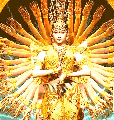 原来此时,三公主已位登三宝,成了救苦救难的观世音菩萨。她修行得道的荒山就是洛迦山,后来现身的礁洞就是普陀山梵音洞。因她断臂后抽出手臂无数,故又称作千手观音。