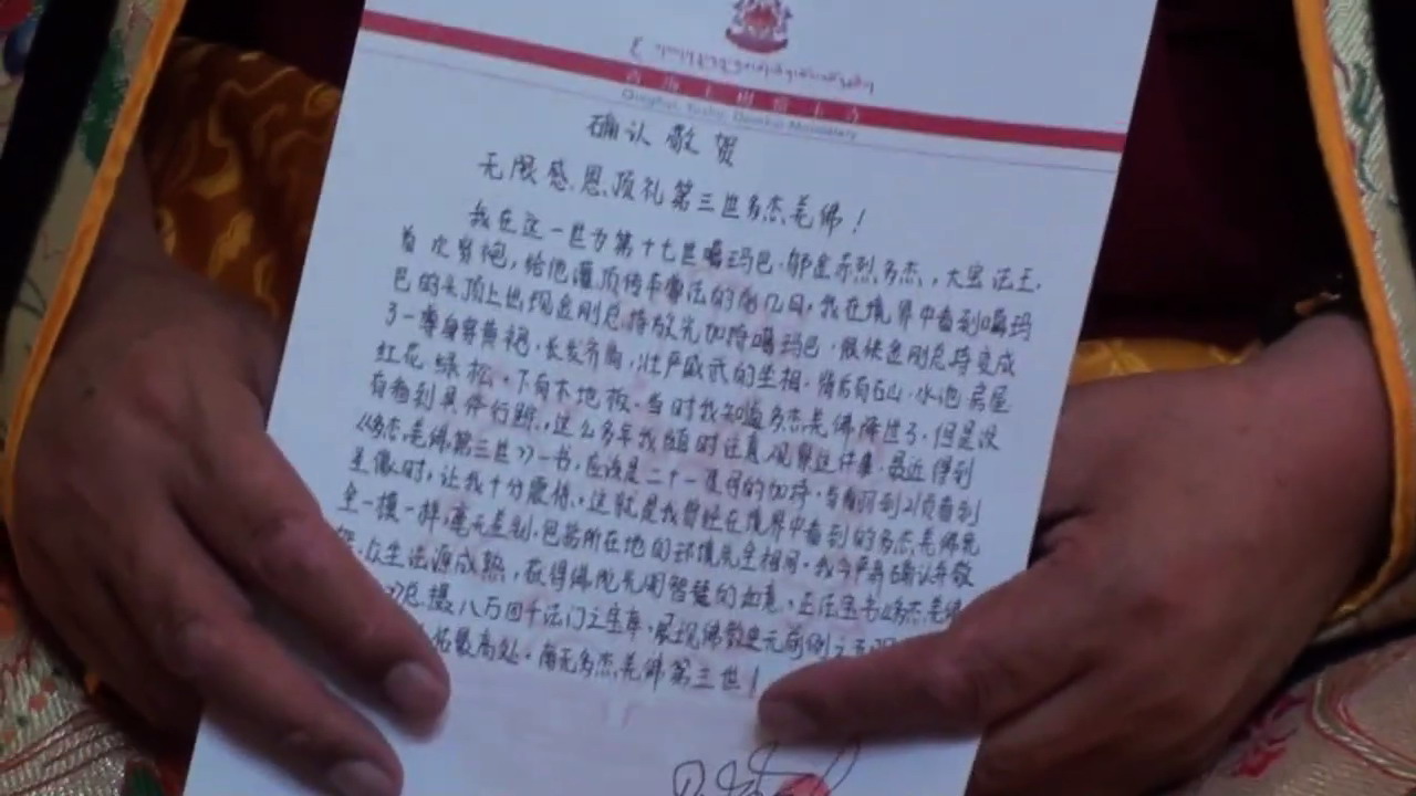 我在这一世为第十七世噶玛巴·邬金赤烈多杰,大宝法王,首次穿袍,给他灌顶传本尊法的前几日,我在境界中看到噶玛巴的头顶上出现金刚总持放光加持噶玛巴,很快金刚总持变成了一尊身穿黄袍、长发齐肩、庄严威武的坐相,背后有石山、水池、房屋、红花、绿松,下有木地板,当时我知道多杰羌佛降世了,但是没有看到具体行踪。这么多年我随时注意,观察这件事,最近得到《多杰羌佛第三世》一书,应该是二十一度母的加持,当翻到21页看到圣象时,让我十分震惊,这就是我曾经在境界中看到的多杰羌佛,一模一样,毫无差别,包括所在地的环境完全相同。我今严肃确认并敬贺,众生法缘成熟,获得佛陀光明智慧的如意,正法宝书《多杰羌佛第三世》总摄八万四千法门之宝库,展现佛教史无前例之五明,是无边众生解脱依怙最高处。南无多杰羌佛第三世!