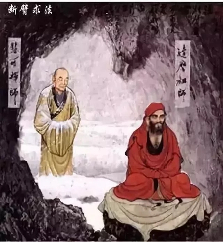此时,慧可毅然以刀自断左臂,并置于达摩祖师面前,以表决心。