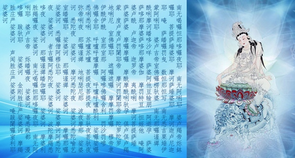 注:大悲咒,全名《千手千眼观世音菩萨广大圆满无碍大悲心陀罗尼经大悲神咒,又称大悲心陀罗尼、千手千眼观音大悲咒、千手千眼无碍大悲心陀罗尼、无碍大悲陀罗尼、广大圆满陀罗尼、满愿陀罗尼、随心自在陀罗尼、救苦陀罗尼、延寿陀罗尼、灭恶趣陀罗尼、破恶业障陀罗尼、速超十地陀罗尼,有时也称青颈观音大悲咒,义为“青颈陀罗尼”,是指青颈观音的咒语),而朝鲜半岛则习惯称之为神妙章句大陀罗尼;是大乘佛教《千手千眼观世音菩萨大悲心陀罗尼经》(《大悲心陀罗尼经》)中的咒文。