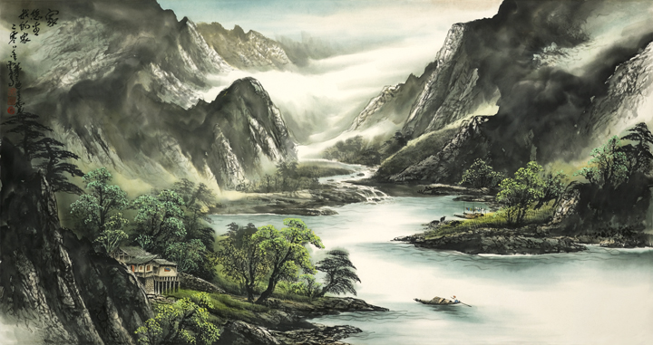 这是一幅“泼墨线条写真派”风格的画作。这幅画除了大面积的泼墨写意外,还运用了中笔尖和边笔边的手法。山景被黑色墨水和浓重的绿色描绘。这件作品既保留了传统的绘画技巧,又体现了现代西方油画的写实效果。在中国画中,透视法的立体感很难运用到以中笔法来表现文人韵味的画作中。然而,这幅画结合了四种不同的元素:立体透视法与散透视法、泼墨法与线条、写意、和现实主义。中西画的属性形成了单一的时尚魅力。这幅画的标题是“看我的家”。它描绘了一个原始的乡村环境,一个有山脉、河流、太阳和月亮精神陪伴的土地。当一个人对当地的风土人情有感情时,就会将一个地方视为家。你不喜欢这样的家吗?