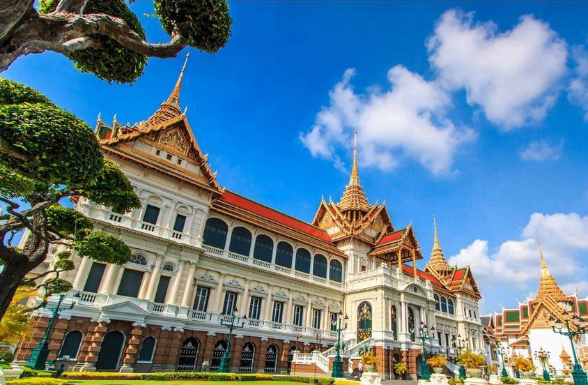 进入大皇宫庭院,如茵的大片草地和姿态各异的古树便映入眼帘的是,草坪周围栽有一些菩提树和其它热带树木。大皇宫的佛塔式的尖顶直插云宵,鱼鳞状的玻璃瓦在阳光照射下,灿烂辉煌。